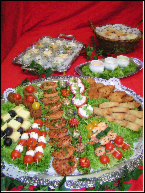 Kasslerbraten, Mettigel, Kraut-, Kartoffel-, Nudelsalat, Baguettestangen,